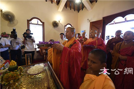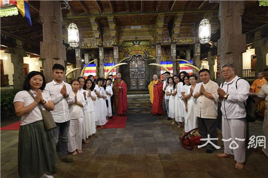 下午五时,中国佛教代表团纯一团长带领全体成员怀着虔敬之心,在乌帕利长老的陪同下瞻礼700年前的佛牙舍利阁,供养鲜花,诵经祈福。据记载,释迦牟尼佛的佛牙舍利只有两颗流传人间,这里供奉的佛牙舍利,无疑是斯里兰卡的至尊国宝,另一枚供奉在中国北京灵光寺,两寺已缔结为友好寺院,遥相呼应,共享今日海上丝绸之路沿线的盛世太平。而平日里,斯国佛教信众只能从门外瞻仰供奉佛牙塔,本次中国佛教代表团纯一团长一行因缘殊胜,团员们有幸得以一一入内,亲自瞻礼金塔内的佛牙舍利。