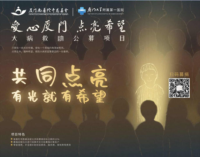 随着2019年南普陀寺慈善会公开募捐资格的获得,以行动响应“爱心厦门”加大重病救助、倡导爱心捐献的号召,在厦门市民政局的指导下,与第一医院携手合作,共同开展“爱心厦门 点亮希望”大病救助公募项目,用公开募捐的方式将项目升级,营造积极有爱有希望的氛围,将向上向善的精神力量转换为爱心善举,呼吁社会大众能做一盏明灯,为身处困境的病患家庭带来一线希望。