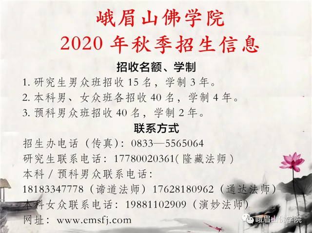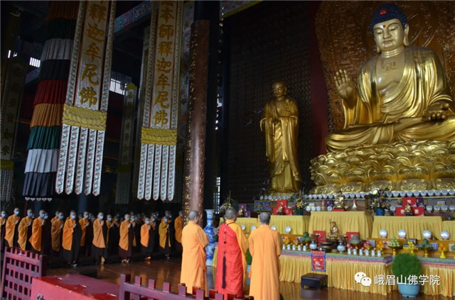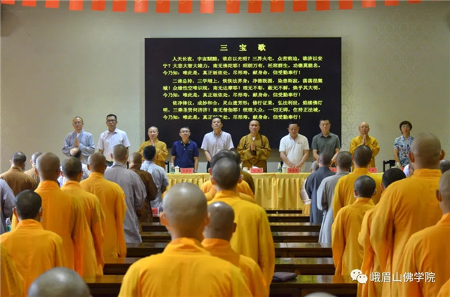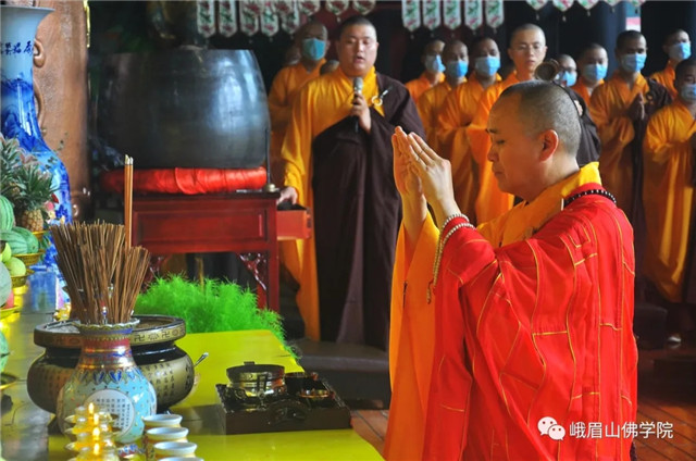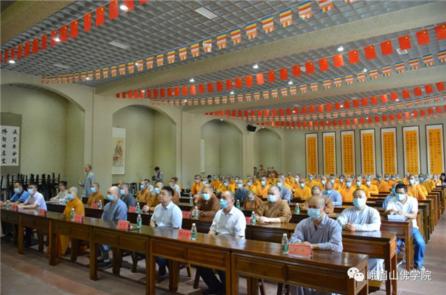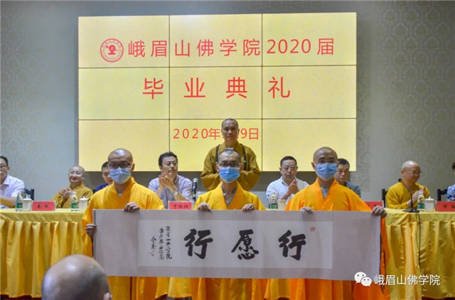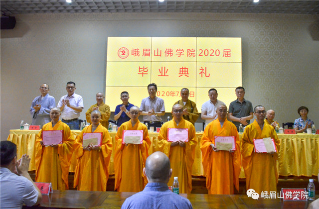 2020年7月9日,峨眉山佛学院在行愿堂隆重举行2020届毕业典礼。出席本次毕业典礼的领导及嘉宾有:四川省民宗委一级巡视员于迎社,四川省民宗委佛道伊处处长伍东炬,四川省民宗委培训中心主任张宜,四川省民宗委宗教综合处调研员李志娟,乐山市民宗委党组成员、机关党委书记吴建宇,峨眉山市委常委、统战部部长钟杰,峨眉山市委统战部副部长、市民宗局局长李文香,峨眉山风景区宗教局局长袁纲,乐山市民宗委佛道伊科科长刘怀斌;中国佛教协会副会长、四川省佛教协会会长、峨眉山佛学院院长永寿大和尚,四川省佛教协会副会长、内江圣水寺方丈智海大和尚,四川省佛教协会副会长、新都宝光寺方丈意寂大和尚;四川省佛教协会副会长、峨眉山佛教协会副会长心定法师、演法法师,四川省佛教协会副会长、峨眉山佛教协会副会长、峨眉山佛学院常务副院长满霖法师,峨眉山佛教协会副会长宏开法师以及峨眉山佛学院全体师生。本次毕业典礼由峨眉山佛学院教务部主任谛道法师主持。
