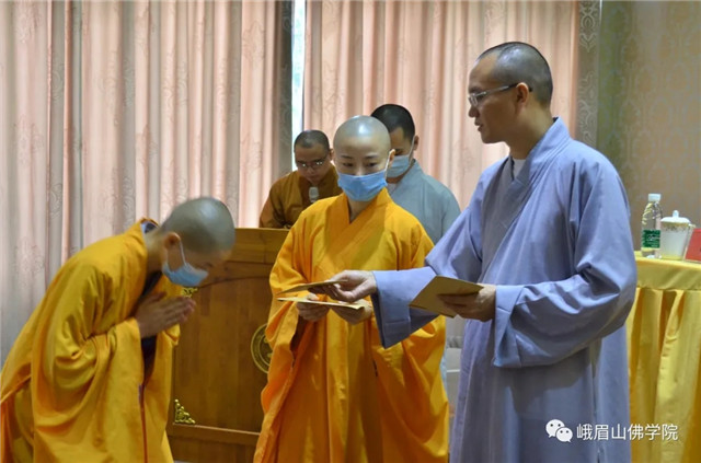 常务副院长满霖法师为上学期获得优秀成绩奖、优秀班委奖和全勤奖的同学颁奖。