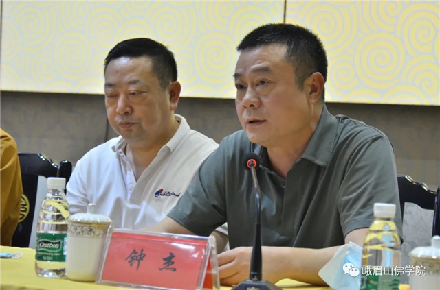 峨眉山市委常委、统战部部长钟杰先生发言。其首先代表中共峨眉山市委统战部对各位学生的毕业表示热烈祝贺,同时对即将走出佛学院、到全国各地寺院和佛教团体工作的毕业学生表示祝福,希望法师们道业早成,智慧圆满,并就此提出几点建议:第一,坚定信念,爱国爱教。希望学生继续发扬爱国爱教传统,拥护中国共产党的领导,始终坚定不移地走中国特色社会主义道路。第二,努力修学。希望法师们在今后修学和弘法实践中,牢记母校教育,不忘师恩,知恩报恩,增进修学,以戒为师,努力成为政治上靠得住、宗教上有造诣、品德上能服众、关键时起作用的佛教人才。第三,积极探索,服务社会。弘扬佛教慈悲济世、服务社会传统,用佛教的智慧与慈悲之心,为社会做贡献。