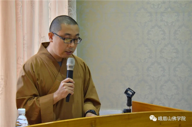 2016级女众部学生代表心九发言。她分享四年求法之路的不易以及最终的收获,表示将铭记责任,勇于担当,以普贤行愿精神为指引来弘法利生。