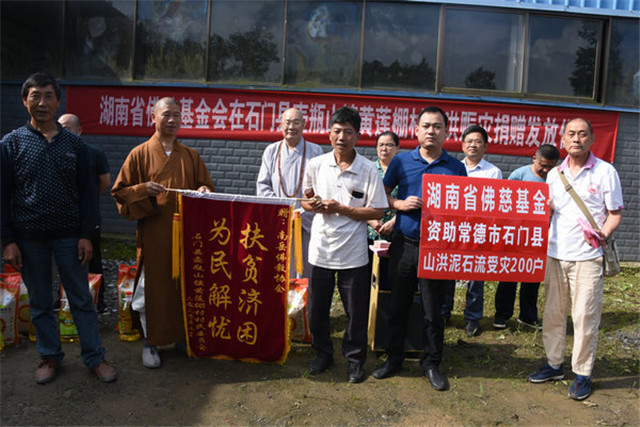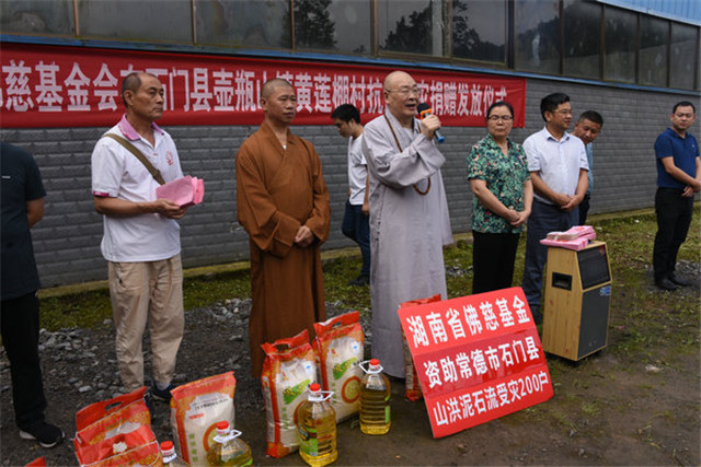 2020年7月30日,得知壶瓶镇灾情后,湖南省佛慈基金会理事长圣辉长老率领省佛协副会长怀泉法师,省佛慈副理事长兼秘书长周仲山、常务副秘书长陈旭等工作人员,冒着酷暑暴雨、驱车近7个小时,为石门县壸瓶山镇200户受灾家庭送去了应急救灾的物资。每个家庭含30斤的大米一包、10斤的食用油一瓶、新衣物一套、以及消毒防疫药品与400元现金,希望一解燃眉之急。本次捐赠活动累计捐赠的物资和现金共达11.64万元。