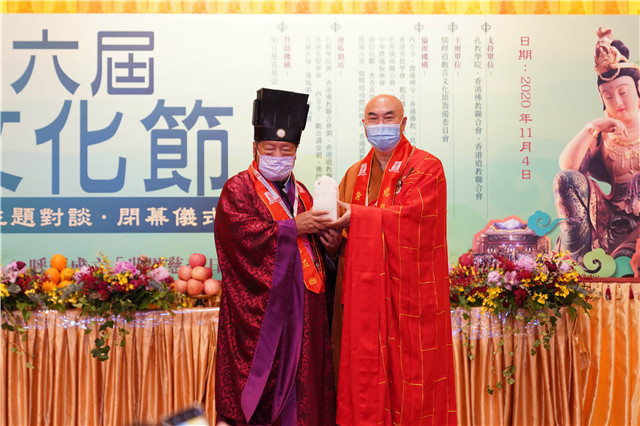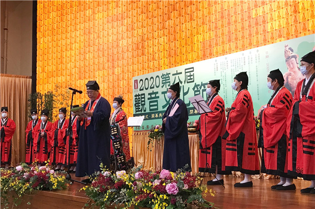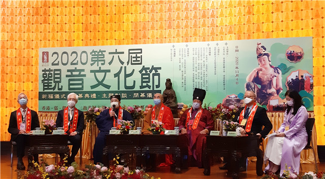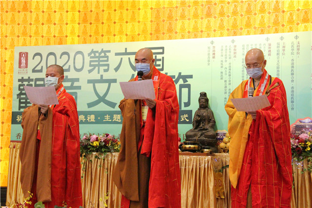 三教祈福圓滿,開幕式正式開始,全體肅立,奏唱國歌。由儒釋道三位宗教領袖共同讀誦《2020第六屆觀音文化節宣言》:今年因受新冠肺炎疫情之影響,是屆觀音文化節以「衆生命運共同體」為主題,論壇改為「儒釋道三教文化講座」,期以三教傳統文化傳遞正面信息,喚起世人對人類及一切衆生命運的深刻反思,用慈悲智慧引導世人在「疫」境中自强息,熱愛生命,並積極傳播正能量,關懷衆生。