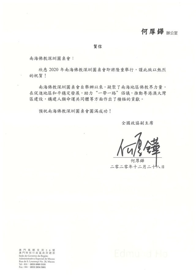 全国政协副主席何厚铧贺信
