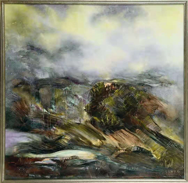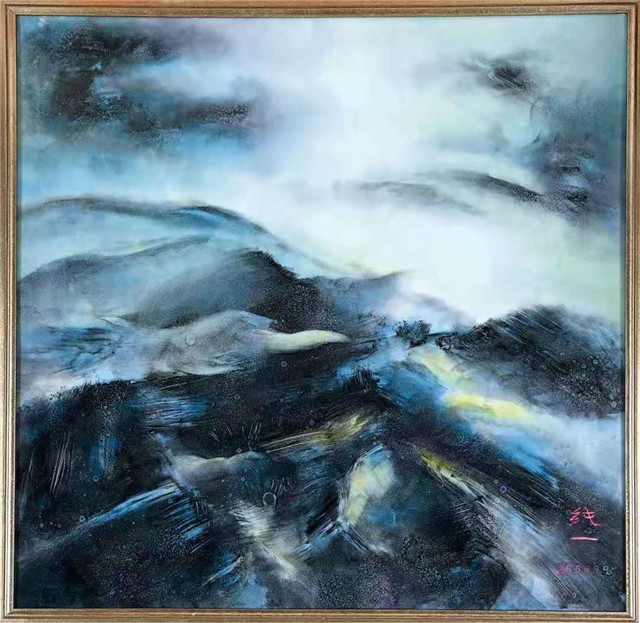 “大千世界等微塵,凡聖含靈一乘因”,用一段純一法師禅詩的節選來表達,也許最貼切。這兩幅靈光作品是他從巴黎回來之後的創作,他在陶瓷上繪畫,用現代油畫和水墨筆法相結合,傳遞佛教經典。瓷板繪畫“靈光1”,爲1350度高溫釉下彩,畫面空靈脫俗,清新脫俗的白色、若隱若現的淺藍、彌漫而出的石青、溫和厚重的玄色,仿佛營造出悠悠山谷之中的悠然一景,它們在純一法師看似界限分明、實則融爲一體的筆法中迸發出獨特的活力。