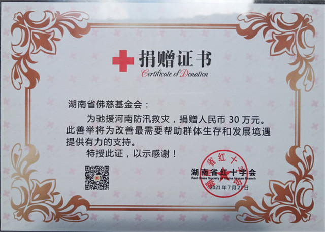 7月28日,是大慈大悲觀音菩薩的成道日,上午9點、湖南省佛慈基金會理事長聖輝長老率基金會工作人員,來到湖南省紅十字會,將募集的30萬元慈善款捐贈出來,馳援河南開展防汛救災工作,並祈願河南人民早日度過水災難關,恢復美好幸福的家園。