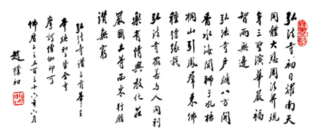 6 月 20 日,趙朴初會見了佛源大和尚,他根據本煥大和尚的要求,請佛源大和尚擔任弘法寺首座。21 日,趙朴初會見了本煥大和尚和淨慧大和尚,商議了弘法寺的今後工作問題。趙朴初再次指出:“我們的廟,不是搞經懺的廟,要有道風、學風,要有文化氣氛,宗教活動可以集中搞一些比較大的活動。我希望把弘法寺建設成一座模範道場。”趙朴初對弘法寺的領導管理方式提出了新的思考,他說:“弘法寺可以設董事會,可以參照香港寶蓮寺的做法,可以吸收社會知名的佛教居士參加。”21 日,趙朴初再次到弘法寺,由下而上,參拜了各座殿堂,最後到法堂同僧眾會面並作簡短講話,鼓勵和期望大家行大願、發大心,把弘法寺建成佛教的模範道場,並同僧眾合影留念。24 日,趙朴初對弘法寺這次慶典活動非常滿意,他用毛筆書寫了三首詞贈送給本煥大和尚:
