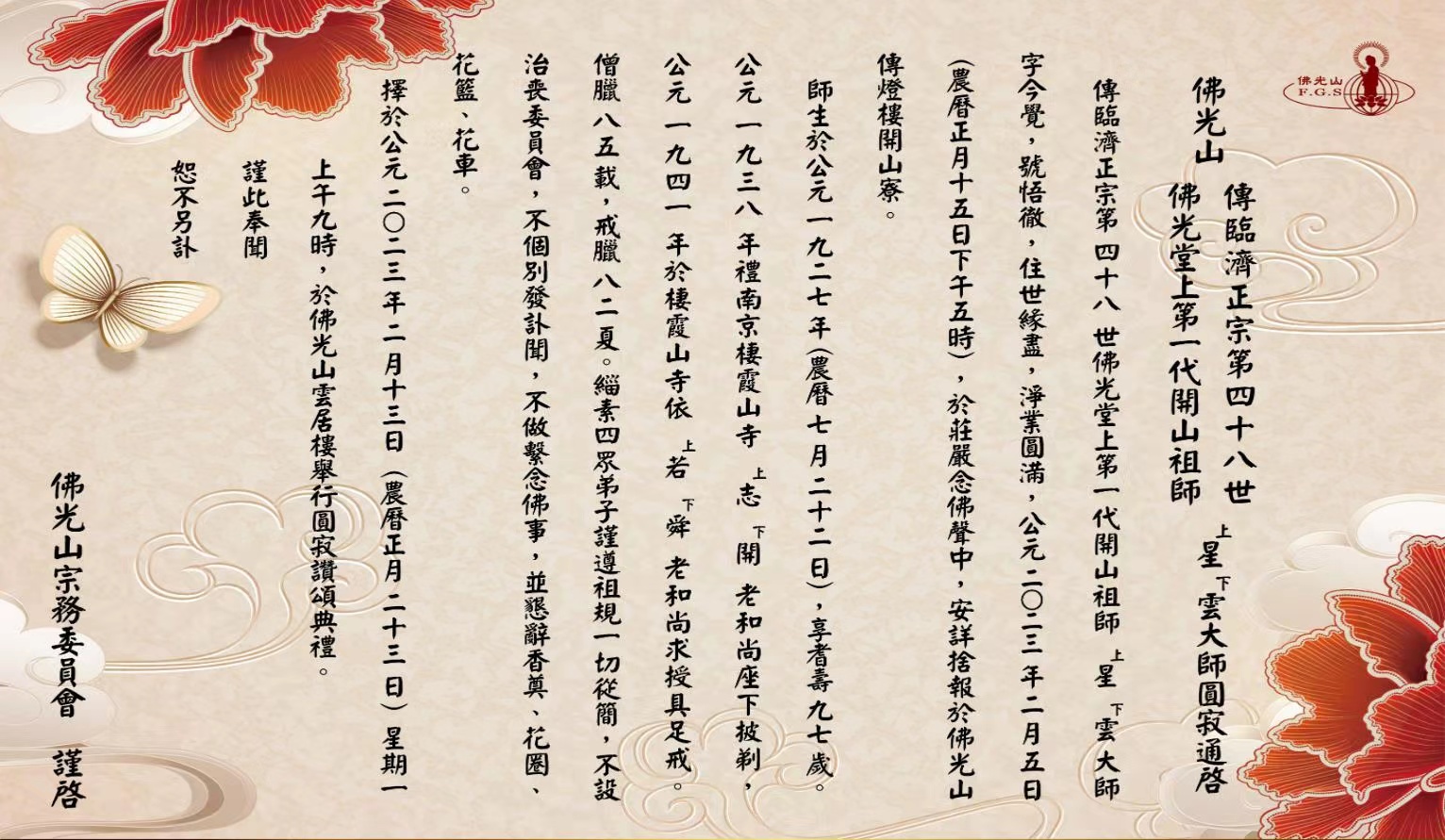 佛光山宗教委員會發佈星雲大師圓寂通啟: