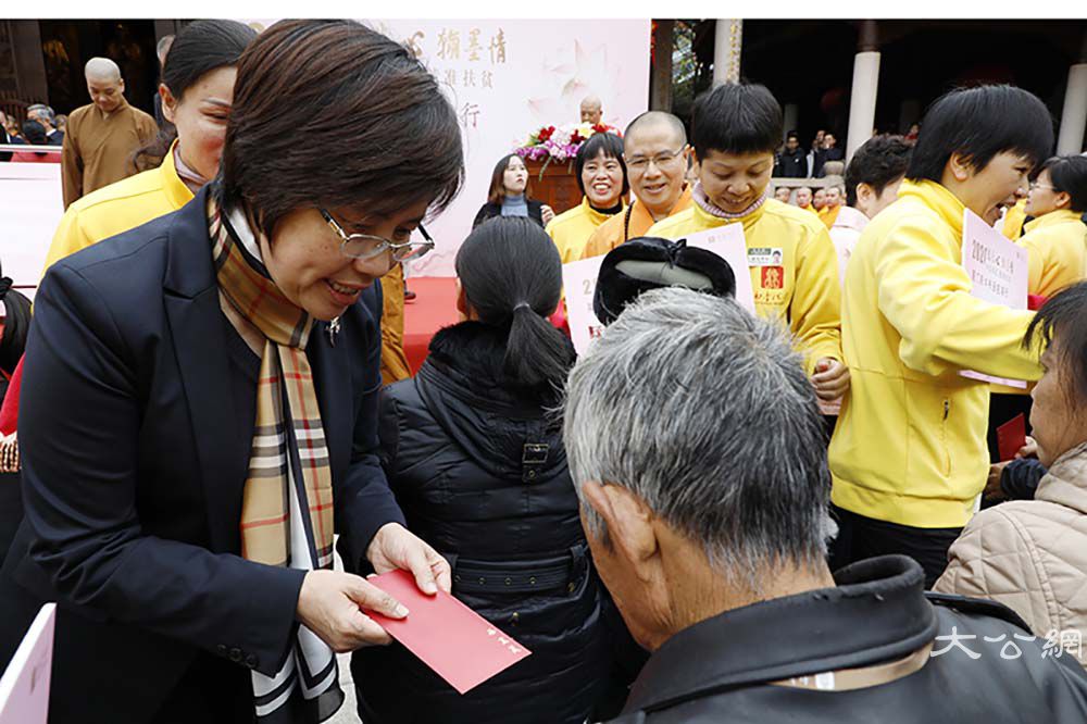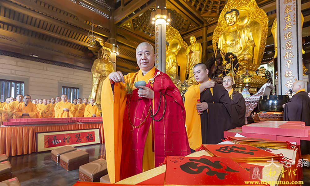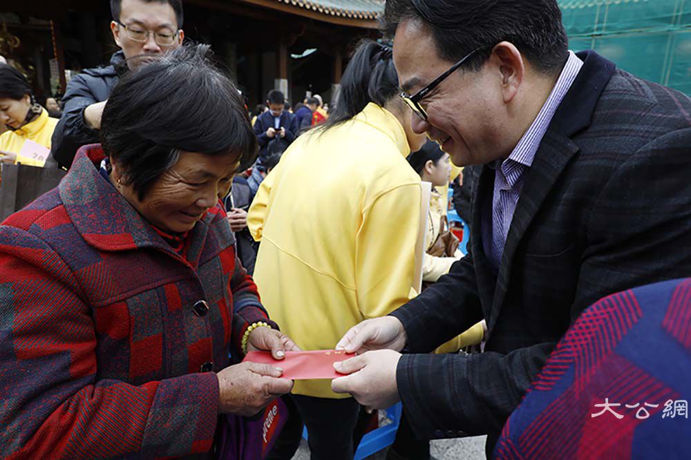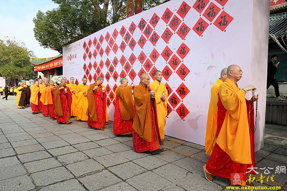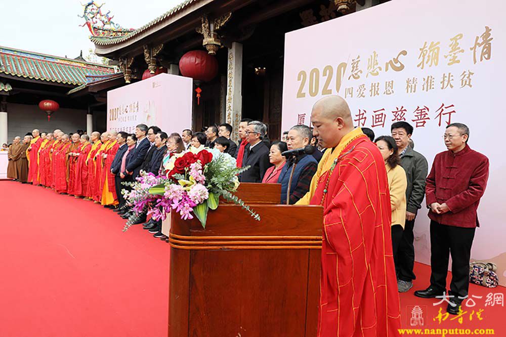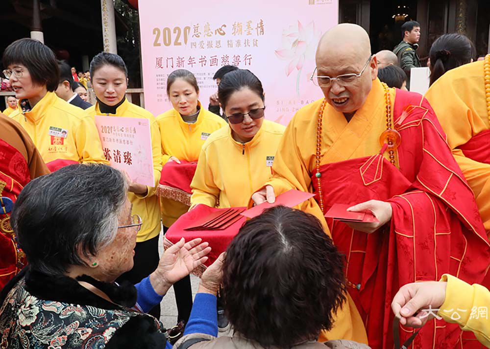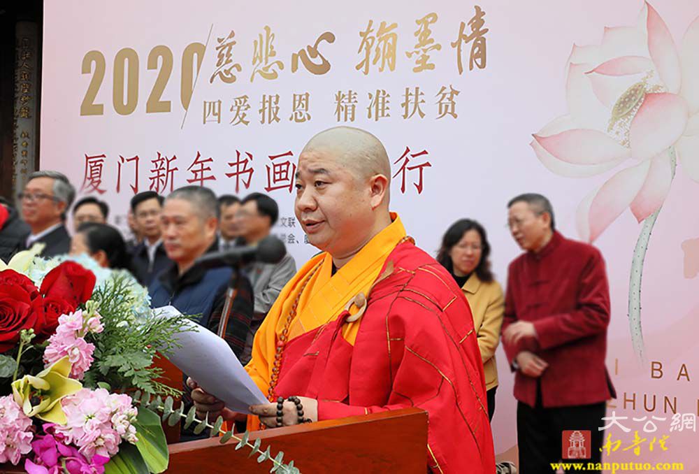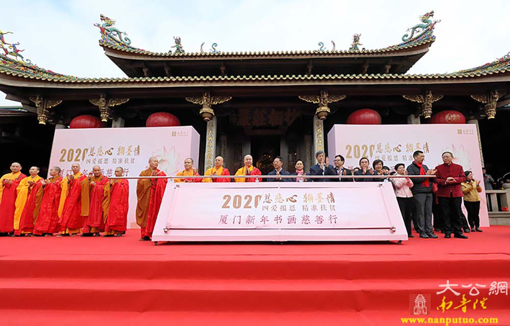 2020年我国将完成脱贫攻坚任务,全面建成小康社会。厦门佛教界与厦门书法艺术界联合社会爱心人士,深入发掘传统文化中促进社会和谐、时代进步、健康文明的内容,学习贯彻省委常委、市委书记胡昌升在“爱心厦门”建设动员大会上的讲话精神,将厦门爱心力量动员起来、汇聚起来。本次活动由市民族与宗教事务局、市民政局、市文联指导,市佛教协会、市书法家协会、市慈善总会和厦门日报社主办,厦门银行、厦门南普陀寺、闽南书画院、南普陀义工服务社承办,厦门张晓寒研究会、市党外知识分子联谊会协办。当天上午9:00,各界人士齐聚一堂,在中国佛教协会副会长、厦门市佛教协会会长、南普陀寺方丈则悟大和尚,以及定恒法师、慧然法师、界象法师、法云法师、净心法师、能元法师、世澄法师、传建法师、明德法师、法尊法师、德煌法师、弘来法师等 13 位大德长老带领下参加“新年诵经祈福法会”,并现场为义卖的书画作品开光洒净,共同祈愿世界和平、国家昌盛、厦门人民幸福安乐。