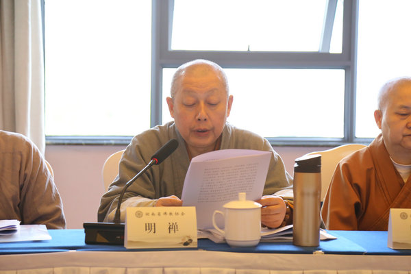 接着,圣辉长老就湖南佛教界如何深入宣传学习贯彻好中国共产党的二十大精神,进行了动员和部署。提出省佛协当前和今后一个时期的工作,就是要组织全省各寺院僧众、居士将学习宣传贯彻党的二十大精神作为首要政治任务,要按照中央统一部署和中央统战部具体要求,原原本本学习党的二十大报告,要在学懂弄通做实上下功夫,切实用习近平新时代中国特色社会主义思想武装头脑、指导实践、推动工作。学习中要牢牢把握以下五个重点:第一、要牢牢把握习近平总书记党中央的核心、全党的核心地位和领航掌舵作用,深刻认识“两个确立”是党在新时代取得的重大政治成果,充分认识新时代十年的伟大成就、伟大变革来之不易、令人振奋,最根本原因在于有习近平总书记为核心的党中央掌舵领航,在于有习近平新时代中国特色社会主义思想的科学指引,在于有“两个确立”、“两个维护”重大政治成果的有力保障。第二、牢牢把握坚定拥护中国共产党的领导,拥护中国特色社会主义制度,持续深入开展爱党爱国爱社会主义主题教育,进一步增强听党话、跟党走的政治自觉和行动自觉。第三、牢牢把握好进一步坚定正确的政治方向,坚定文化自信,要以习近平新时代新思想为指导,对佛教教理教义作出有益于新征程的合理阐释。第四、牢牢把握好全面从严治教的重要意义,在全面从严治教中要做好五个方面的工作:(一)是抓思想从严(二)是抓法纪从严(三)是抓戒律从严(四)是抓制度从严(五)是抓队伍从严。从严治教,重在“严”字,实在“治”字。 第五、牢牢把握团结奋斗的时代要求,建设中国式社会主义强国,是亿万人民共同的事业,中国宗教如何发挥中国共产党团结和联系广大人民群众的桥梁与纽带作用,是历史的选择,时代的要求。