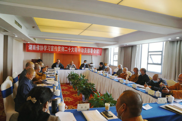 为深入学习贯彻好中国共产党的二十大精神,现在,我们湖南省佛教协会的主要工作,就是组织全省各寺院僧众、居士将学习宣传贯彻党的二十大精神作为当前和今后一个时期的首要政治任务。要按照中央统一部署和中央统战部具体要求,原原本本学习党的二十大报告,要在学懂弄通做实上下功夫,切实用习近平新时代中国特色社会主义思想武装头脑、指导实践、推动工作;要将学习宣传贯彻党的二十大精神与贯彻落实中央统战工作会议、全国宗教工作会议精神,湖南佛教事业的健康发展有机结合、相互贯通、一体推进;要牢牢把握以下几个重点: