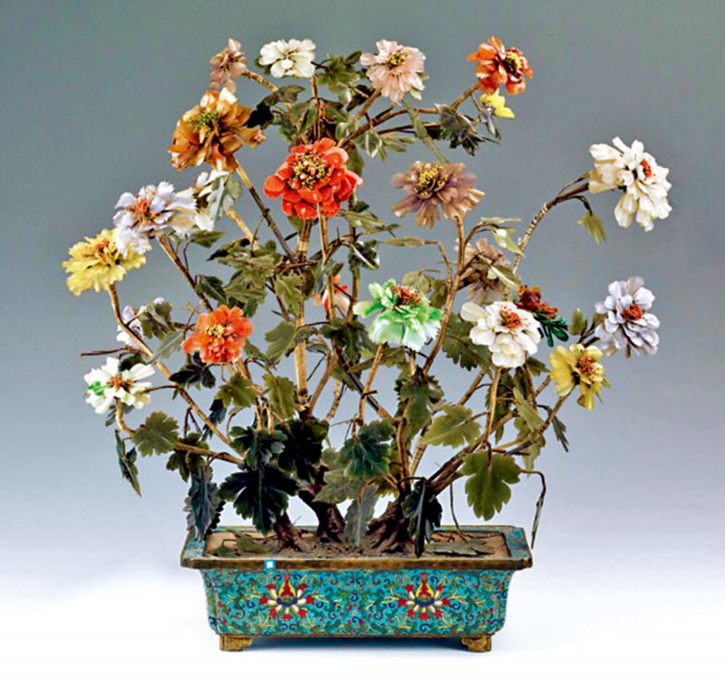 清代宮廷偏好奢華的寶石花卉盆景妝點室內空間,展出的這件花盆造型的「聚寶盆」就是此類盆景。這件藏品以銅胎湖藍琺瑯釉為底,上飾寶相花及纏枝。盆中是各種寶石雕琢的菊花,有白玉、翡翠、碧玉、黃玉、紫晶、茶晶、珊瑚等,色彩紛呈。設景主次分明、錯落有致,呈現出欣欣向榮的風姿神韻,也凝聚着吉祥如意的美好寓意。
