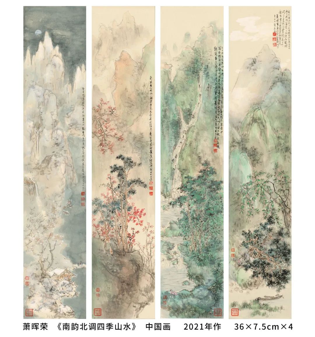 萧晖荣的中国画《南韵北调四季山水》(36x7.5cm X4)获特邀参展。萧晖荣的小品画,题材虽多取自古人,却是由心而发,以融汇古今的艺术眼光来驾驭这些题材。他通过绘制传统题材与古人对话,进而挖掘出传统题材的当代意义,在画面中注入强烈的时代精神。萧晖荣作画,注重从他所理解的当代语境出发,强调以我为主,以积极的态度去选择合适的题材以表现当下,表达自我。其画繁而有度,疏而有法,融当代精神于传统笔墨,寓雄大襟怀于高远意境,在在处处,皆可见出其匠心独运。总的来说,《南韵北调四季山水》虽然尺幅短小,细观之却有包容万象之气概,种种奇观异景把玩不尽,大有“纳须弥于芥子”之奇妙。